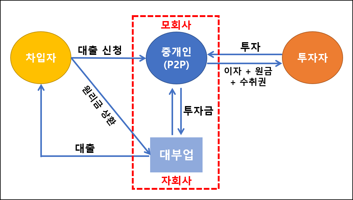법적 사유 때문에 어쩔 수 없이 P2P 중개업체는 차입자에게 돈을 직접적으로 전달하지 못하고, 대부업체를 통해 대출을 해주는데, 결과론적으로 이러한 이유 때문에 P2P 중개업체는 대부업을 자회사로 가지게 된다.
